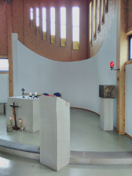 Eigentlich ist die Kirche nicht schön. Sie ist in einer Art von vulgarisiertem Bauhausstil gebaut, Kreuz und Statuen – Maria und Johannes – überm Altar lassen keinen Kunstwert erkennen. Doch die Anordnung ist völlig sinngemäß, und so, verbunden mit den Riten der Messe, entfaltet sich wirkliche Schönheit.